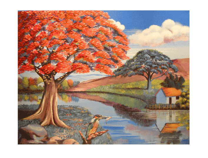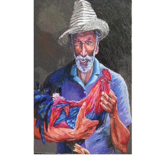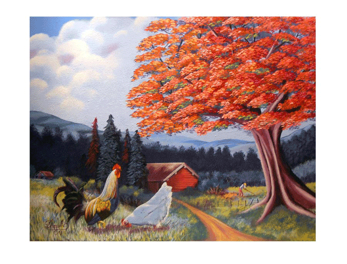his paintings portray the Flanboyan Tree and the Rooster as main subjects. With their lively colors and their symbolism these elements can