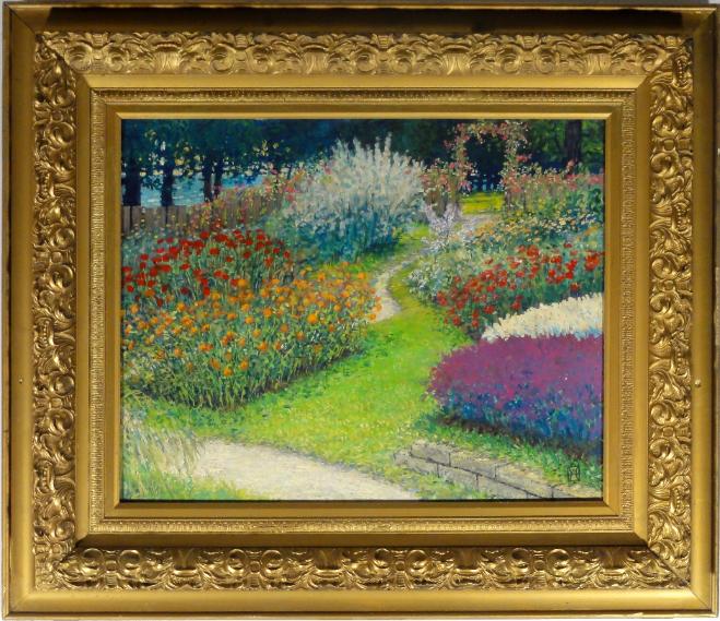 Wally Ames is a well-listed American impressionist painter born in Connecticut 1942. He currently resides in Vermont and is an oil painter best known for his floral landscapes, rural landscapes, and still life works. His paintings are gaining in collectability and value with one reaching $2400.00 at MutualArt.com. His work is well respected, highly praised, and are expected to increase in value throughout the coming years. This painting is one of his best works. Signed WA for Wally Ames in his distinctive monogram lower right front and also his signature name on back.